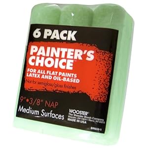 | Wooster Brush BR659-9 Painter's Choice Roller Cover with .375-Inch Nap, 6-Pack , 9-Inch | | Access the most advanced RSS tools and use them to your advantage. | 2013-04-07 14:08:25.607105-04 Category: Tools & Home Improvement Vendor: Mint green fabric for all flat paints Polypropylene core resists water and solvents and cracking White fabric rollers with poly  Product Description : Amazon.comThe Wooster 9-by-3/8-inch nap paint roller covers are designed for all flat paints, latex and oil-based. These white fabric rollers feature a polypropylene core to resist water, solvents, and cracking. These covers are ideal for medium surfaces. (They are not designed for semi-gloss or gloss finishes.) The nap measures 3/8 inches; the roller measures 9 inches. This pack includes six nap paint roller covers. Product Description : Mint green good quality fabric for all flat paints. Polypropylene core resists water, solvents and cracking. See all Product Description : Find out more | |